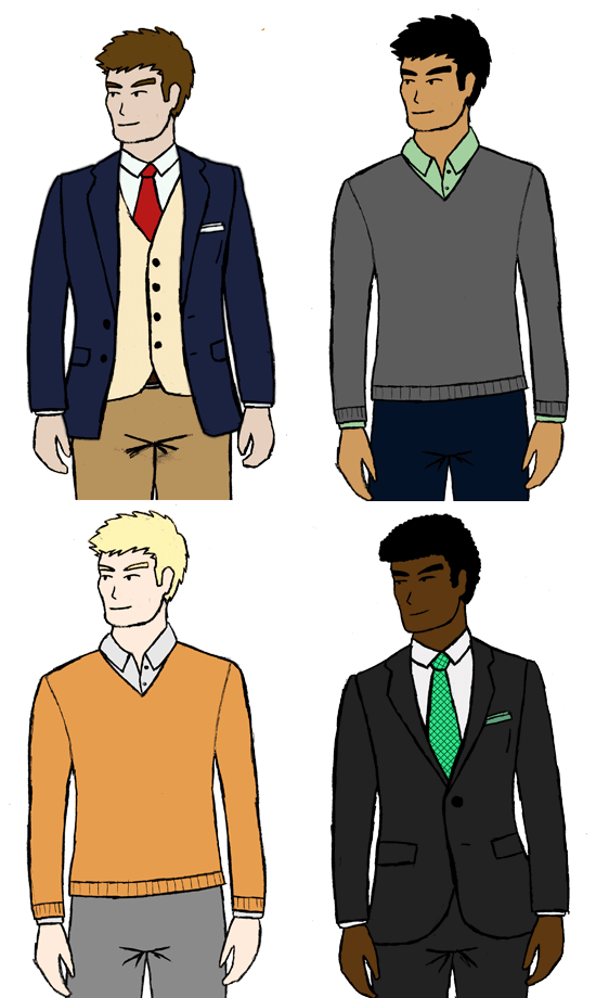 • Red tie, white shirt, navy blazer, camel cardigan, khaki pants